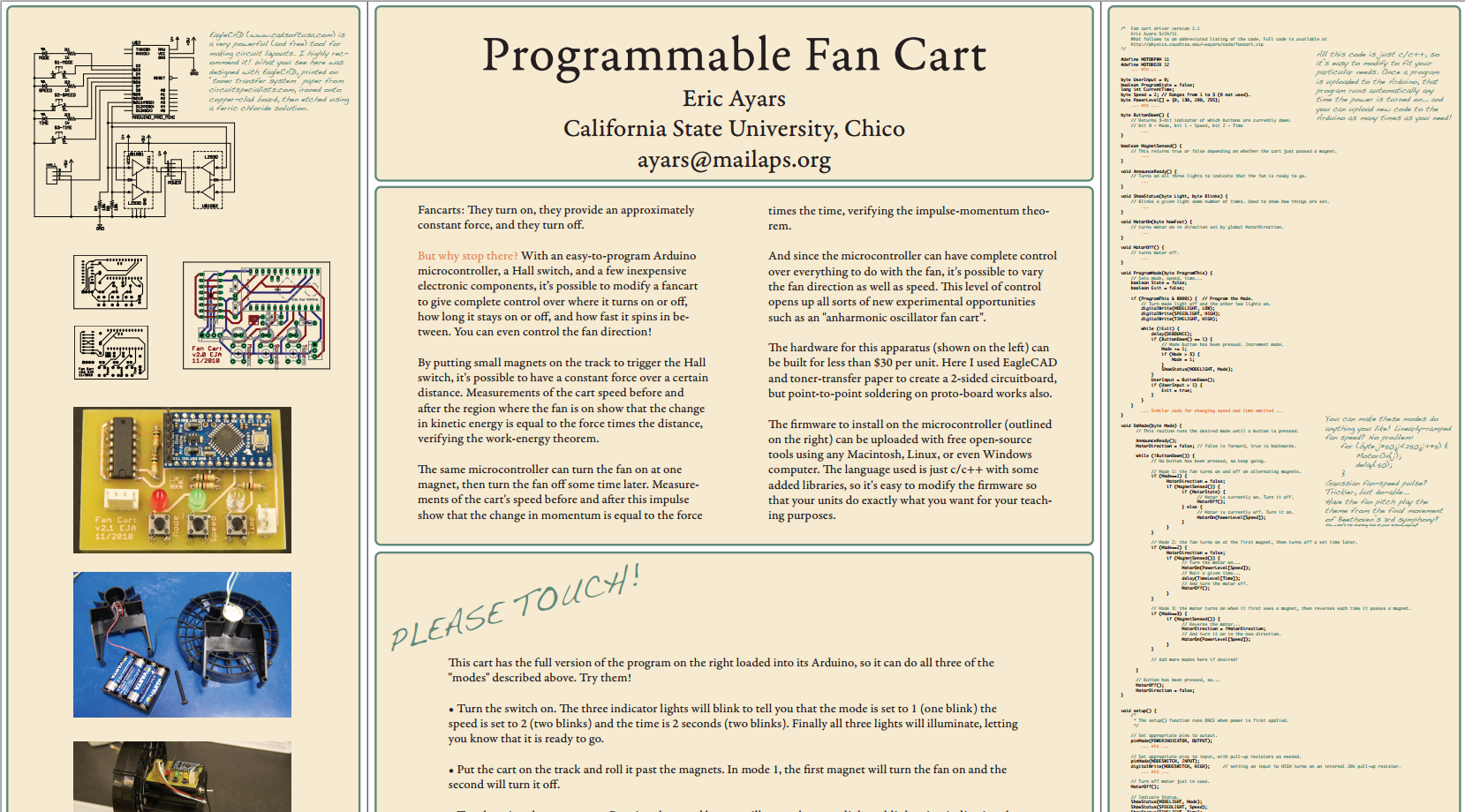 Dr.Ayars quickly hacked together an Arduino/L293D based prototype, with PWM control and Reed Switch triggering. But he wasn’t satisfied. Just a few months later he documented an improved version, the PCB resized to fit in the holder for the Time Pulse Accessory, the breadth of options breadthened, and the code refactored. This iteration won him the AAPT apparatus competition’s First Prize!