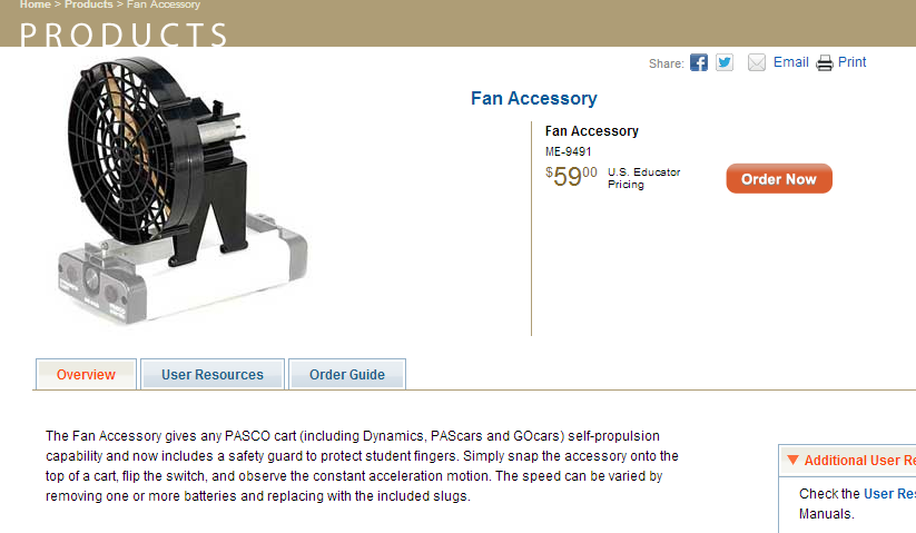 A little under a month ago, my physics teacher ran into a few limitations of the astronomically priced PASCO Classic Dynamics System & Fan accessory (above)  — the fan accessory is not programmable, neither is it intuitively adjustable in any way!